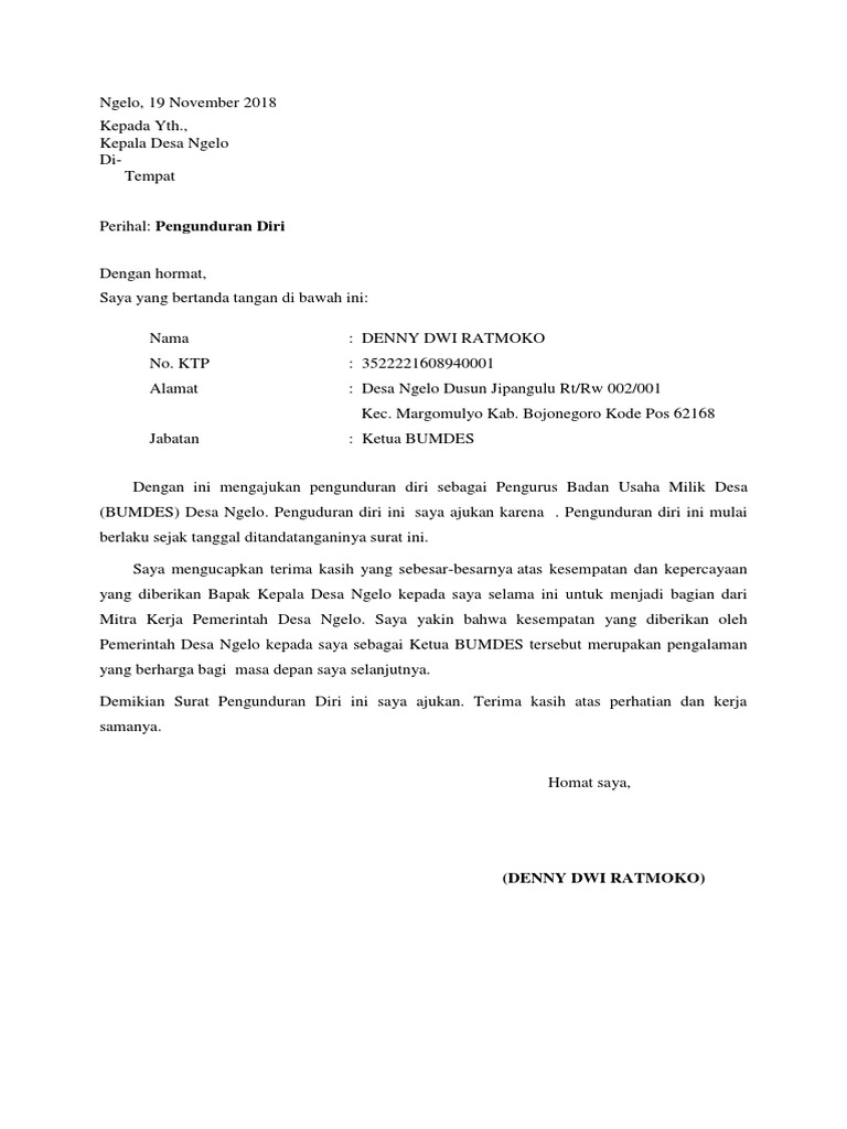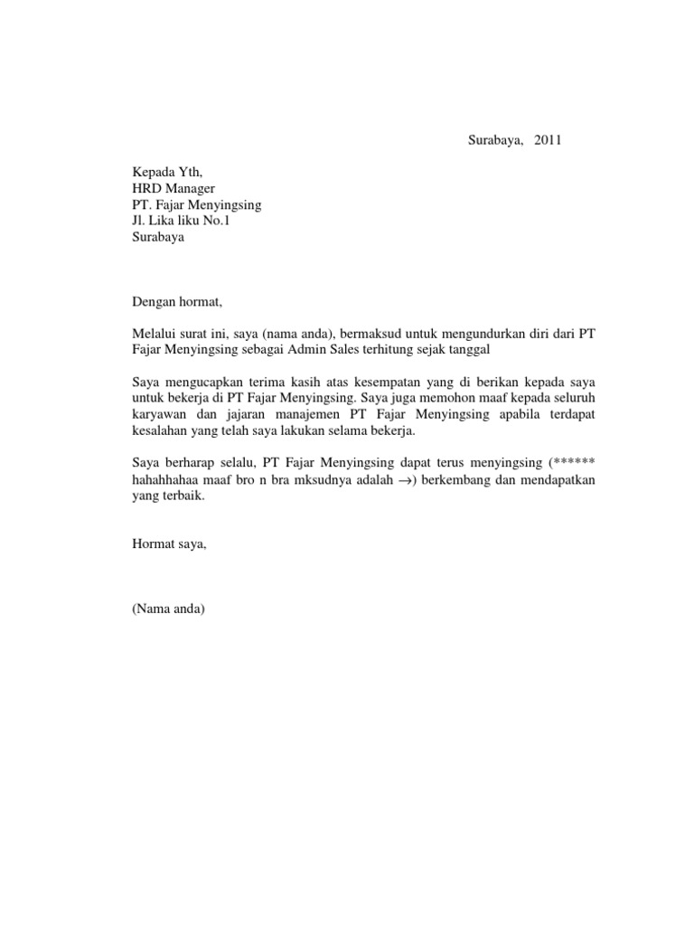 Kali ini nomifrod akan membagikan contoh surat pengunduran diri guru. Sebelum kita memulai pambahasan contoh surat pengunduran diri, anda harus memperhatikan format surat pengunduran diri secara umum, berikut penjelasanya Namun dalam mengundurkan diri tentu saja ada prosesnya, dalam hal ini dengan cara menggunakan surat resign. Download as docx, pdf, txt or read online from scribd.